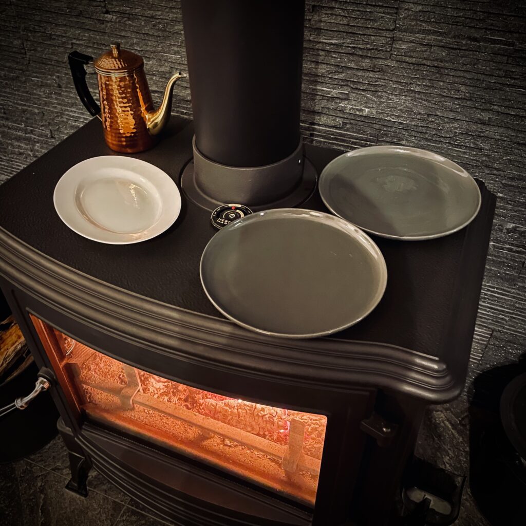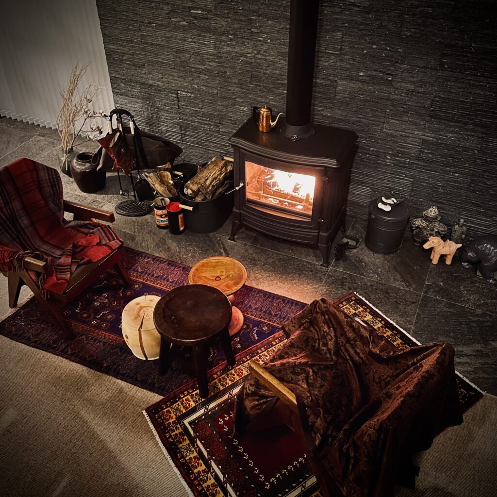 オフィス内では薪ストーブが稼働し始め、空間にやわらかな温もりが広がっています。